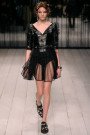 Here was another transporting and hyper-feminine collection from Sarah Burton for Alexander McQueen. Dreamy gauzy dresses in knits as fine as cobwebs; tuberose flowers hand-painted on leather coats and corsets, and feathered skirts made of ostrich plumes that had been lacquered to give them a brooding aspect. The designer decorated her clothes and accessories with talismans and surreal symbols, including pocket watches, butterflies, horseshoes, lips and eyes.