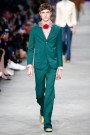 Working against a backdrop of palms and tropical greens the creative director sent out models in baseball caps wearing sports-inspired riffs on the traditional suit. Baseball style and other abbreviated jackets were done in pinstripes — some with contrast piping — and were paired with roomy, pleated trousers. More traditional suits were worn over T-shirts, or layered over sweaters accessorized with colorful skinny ties. Colors were of the earth — plum, ochre, cocoa, turquoise and palm leaf green — and came in blocks or stripes on everything from knits to outerwear. Baseball and leather jackets were adorned with cactus and monkey designs on the back — Fifties greaser style — while one sweater was paved with varsity letter patches, in keeping with the youthful spin.