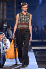 The latter motif mushroomed into pants and zippered blousons resembling pilots’ uniforms, banded or piped in safety orange and patched with utility pockets. The shorts also came in leather, shown with plunging tanks or boxy, zippered jackets.