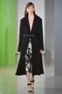 The dominant coat silhouette was a gentle wrap in black and camel double cashmere trimmed with raw blanket stitching and tied with a corded leather belt that created a gentle hourglass shape. Chunky Aran knits came as off-shoulder dresses and tops with exaggerated fold-over collars and fringed hems. There was an easy, vaguely Eastern feel to the asymmetrical cuts, particularly with the oversize floral prints of anemones and chrysanthemums silhouetted in black against white backgrounds on easy color-blocked dresses and wrap tops and skirts, again with corded details.