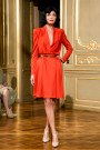 During an imtimate presentation at the Residence of the Dutch Ambassador in Paris Jan Taminiau told his SS2015 couture story. A collection for which the talented designer shook things up a bit. His three models wore wigs (in red, black and blonde) and therefore looked outspoken. Like characters out a Marvel Comic Strip, Jan Taminiau’s source of inspiration for this collection named Marvelous. More than ever before Jan put the focus of his designs on the hips, waist, breasts, buttocks and shoulders, honouring those parts of the female body women are sometimes afraid to reveal. The dresses seemed to give the models an even better, very powerful posture and a touch of super heroin toughness. A split cape added to that effect. Yet no matter how rigid and tough some of the creations appeared, hours and hours of handwork were put into them. Like the case with some embroidered star and feather shaped applications, glass beads and shiny sequins. Feathers made out of unravelled fabric popped up as well, making a strapless evening gown feel classic and an orange cocktail number look unique. Two pairs of pants and a full on glitter bodysuit made their appearance. Other than that Jan only presented his audience with dresses (both cocktail and evening) as “the shape of a dress is one in which his ideas can be released to the fullest”. A warm color palette of shades like orange, copper, nude, red, yellow and mint green worked lovely with the gold colored setting of the Parisian residence. We’re curious to see which power women will end up wearing these designs. Fact is any woman wearing Jan Taminiau will always look like a superwoman. And who wouldn’t want ‘ Jan’ in a star shape embroidery written on her chest?