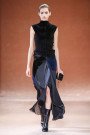 Alexandser Wang presented a totally black collection, well almost. Technically the lineup was not totally black — there were two ivory fisherman sweaters worn with stonewashed jeans, two red plaids and a few metallic mesh getups. The rest was pitch black and hardcore, framed within the street section of heavy metal.