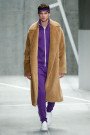 A red tracksuit with the words “René Did It First” printed on the jacket and matching headband kicked off the men’s offering at Lacoste. Felipe Oliveira Baptista, probably trying to state the label’s colonizing status in light of the current ath/leisure trend, presented a collection full of Seventies references with an sporty urban style that felt a bit “Royal Tenenbaums” given the nutmeg color in trenches, fur coats and suits. The use of Art Deco prints in sweatshirts and graphic stripe details in softly tailored suits and coats, kept the look modern.