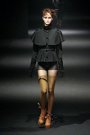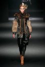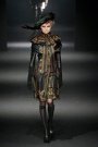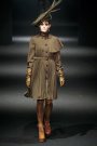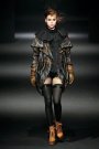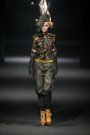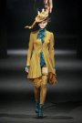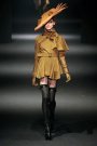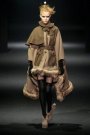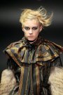 Inspired by drawings of Aubrey Beardsley (an influential illustrator and writer in the late 19th century) Bill Gaytten came up with luxurious ensembles for English women. His models were all dressed up in asymmetrical capes and dresses with enormous collars, large gloves and feather fascinators as their accessories. Especially the delicate designs in pleated satin and embroidered sheer fabrics appeared graceful. Done in shades of olive green, cinnamon, light mint and ruby red they seemed perfect for winter. And even though you could see every bit of the models’ bodies through them it still made the girls look classy.