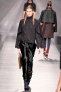 In a palette of purple, navy, forest green, dark brown and black Frida Giannini presented a dark, romantic Gucci collection. She called it modern day romanticism, wit a touch of military, dandy and elegance. There were flat heeled riding boots, wide cut, cropped jackets with gold buttons and softly belted velvet smoking jackets. There was more velvet in the appliqué flowers on translucent chiffon and lace blouses. Skirts had a split in the back, riding trousers flounced wide over each thigh and the full lengtht column dresses were shiny and glittering. Giannini focused on day clothes worn in texturally intense layerings. It sometimes reminded of good old Yves St. Laurent.