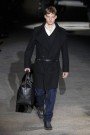 It seemed the Viktor & Rolf Monsieur winter collection 2011 was sampled as if it was a normal dayroutine starting with a man in his homewear, a gray combination of a sweater and a slim jersey sportspants/longjohn, followed by a man in white undies and a shirt and ending by a man dressed in a bomber-jacket covering his smoking. In between the designers presented everything a men’s wardrobe should contain during the day and eveninghours: a comfy cardigan, a lammy jacket, a trenchcoat, a good knit and a few nice looking suits in black, gray or even red. Having those basics a man can vary as much as he can. He can even wear his longjohn with a dressy jacket or let his shirt peep out. It gave the rather serious and formal looking clothes a more informal character.