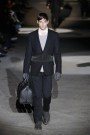 The Louis Vuitton-collection was a pitch dark one, with lots of black, dark-blue, brown and highlighted by off-white and the brightest of red. The silhouette was rather straight and sometimes the waist was accentuated with a belt or ribbon tied around it. It seemed designer Paul Helbers played with the volumes of a down jacket, textures of velvet, leather and fur, the mix of formal with informal. The coat played a big part in this collection, from kimono-inspired to parka. Different fabrics used in one item gave a contemporary look, the shiny and sharp body-warmers had the look of body armor. Luckily the red and white flowing fabrics like silk added some air into the rather strict and sober collection.