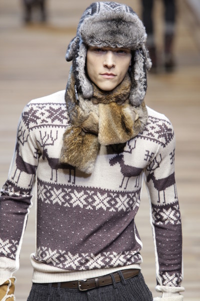 The Bikkembergs collection was inspired by the world of mountaineering, so the models were dressed in a way they could resist extreme weather conditions. They wore knitted sweaters and were wrapped in cashmere and mohair. Most of them had caps on their heads and wore thick gloves. They walked the runway on flip flops with thick socks in it and high boots with colored laces.