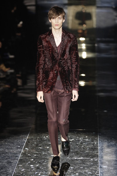 Gucci showed us the tasteful side of the Seventies – a period where a lot of mensweardesigners refer to for their fall-collections. Tasteful as in: monochrome camel, beige, black and off-white, faded blues, yellow and reds but also rich colors. This was not the most remarkeable Gucci-collection, as in new. The silhouet is still slim, with shorter jackets which had broader lapels, no excess of big accessories except for classic Gucci loafers, big sunglasses and a big bag. The Gucci man is still an angry young playboy, but he’s waiting for better times to come. It’s remarkablke that hardly any label shows tuxedo’s these days, I guess partytime is over. ‘ Come as you are’ sang Kurt Cobain while the last pack of models strolled down the runway. The Gucci-man just wears a velvet jacket in midnightblue, bottlegreen or burgundy. No bow, no shirt.