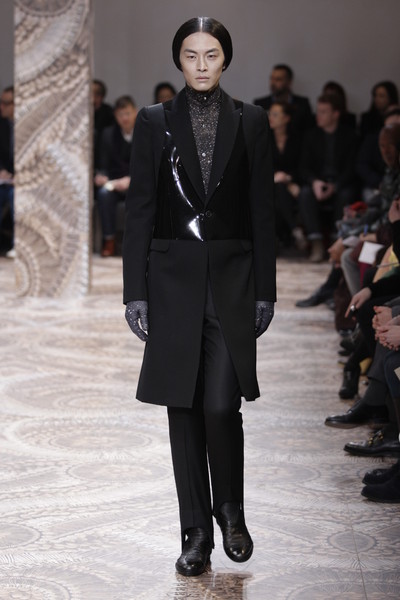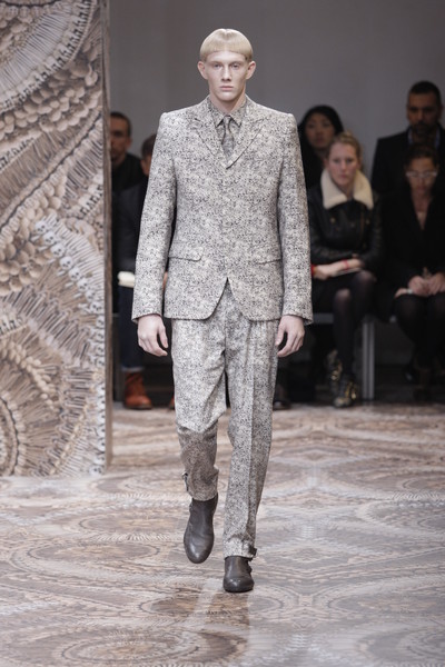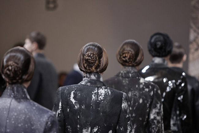The Monsieur-collection lies close to what the designers like themselves, a mix of streetwear and tailored suits with a touch of the unexpected. For next fall Viktor & Rolf unveiled a refined collection in a dark (mostly black) color palette mixing formal and casual, ranging from quilting and trousers with elasticated cuffs and a focus at the dinner jacket. Splashes of black paint were on the floor but also at trousers, a models’ face and in silver on a T-shirt.The unexpected lies in the layering and mix of different textures and fabrics. Of course the collection has all the ingredients of next fall: the large, comfy cardigan, the suit, the knits, the boots, the grays and the blacks.