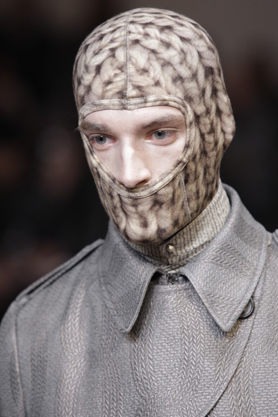 The Alexander McQueen-collection for fall 2010 was an entirely printed collection—of suits, leather coats, ski masks, even shoes. Some of the prints were on the dark side (like a pile of human skulls and bones), some simply puzzling (smeared paint, fur, knits, drops of rain). The silhouet was pretty stiff and straight, with ski-like trousers, shorter jackets and 3/4 coats sometimes half patent/half wool.
