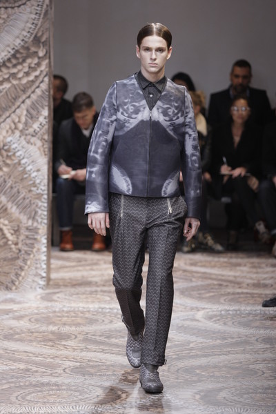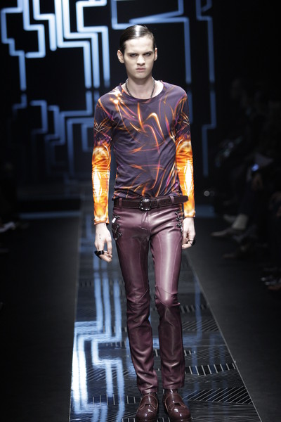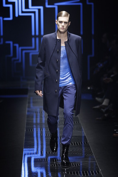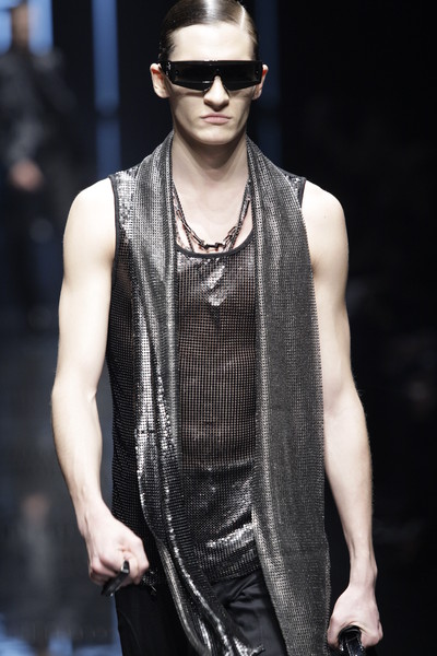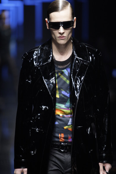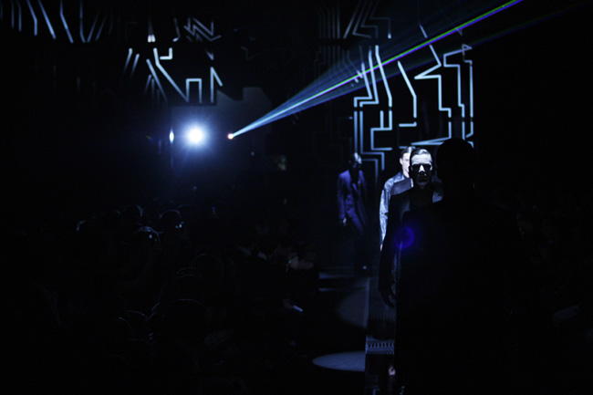 Alexandre Plokhov, design director for Versace menswear, took the new movie ‘Tron Legacy’ as inspiration for his fall-collection. The result was a vision of a futuristic world, but also back to Gianni Versace’s days of hard-edged metal mesh. This was agood show, sharp as a laser beam and glossy. Plokhov modernized Gianni’s original ideas, giving the black leather a bursting-bubble decoration and weaving metal mesh into vests or as shoulder pieces. The neon-patterns on shirts looked like tie-dye leaking, but were all digital. These were often mixed with sleek suits in cyber blue.