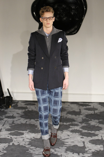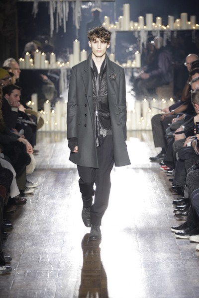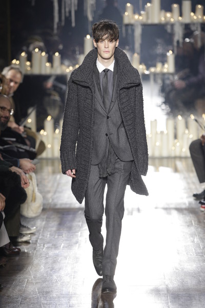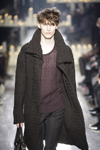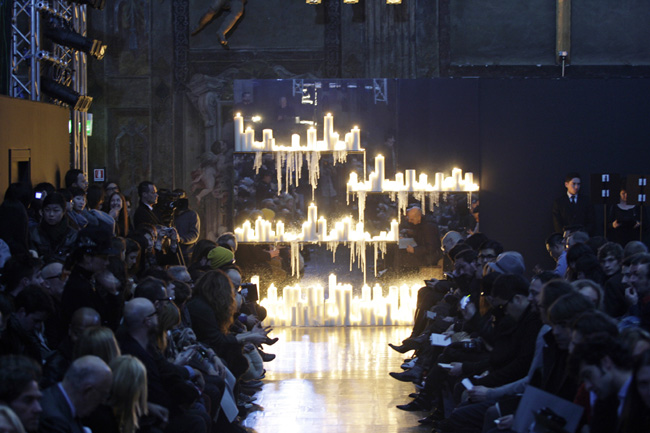 An impression of the stage at John Varvatos: an old church with scattered fresco’s and candlelight in the back. A perfect setting for the collection: rockers turned into businessmen but still sticking to black, their boots, leather and bulky knits.