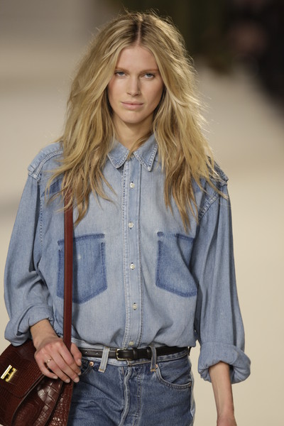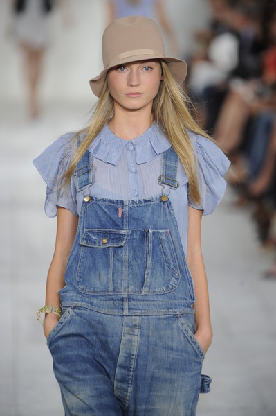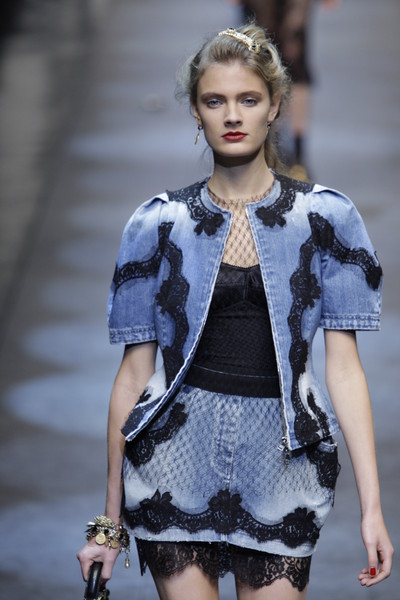Jeans are one of the few things in fashion that never go out of style. On the contrary other denim outfits seem to come and go every few years. For the coming season several brands carefully introduced a few denim designs. We saw denim blouses, skirts and dungarees. At Jean Paul Gaultier streetwise models wore darkblue denim overalls. The designs were immediately recognizable as JPG’s because of the cone-bra details he added. Dolce & Gabbana used denim in both their collections. At the D&G western inspired show denim was mixed with white, beige or brown in almost every look. Pieces of lace or leather were stitched at the designs. For her first collection for Twenty8Twelve Sienna Miller also created some denim blouses and tough-looking sleeveless denim motorjackets with frayed ends. Hannah MacGibbon designed exactly one denim look for Chloé. It didn’t match any of the other outfits from the show, but she came up with it at the right time. (Tess van Daelen)