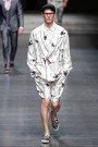 Neil Barrett stepped away from his sporty, street-vibe style and managed to change masculine classics from around the world to a modern universal wardrobe. The look was still urban and fresh, yet more ageless in design. He used batik prints, camouflage, nautical stripes and kimono patterns – reworked and fused together to conjure “an idea of a global masculinity.” The mix of patterns did not overwhelm, because Barrett kept them together with one color story: all gradations of navy and indigo, with touches of black and white. The tight palette counterbalanced a wider spectrum of fabrics, with lots of denim. Low in the crotch but narrow on the hip, cuffed or with rolled-up hems, the indigo bottoms let off an air of American workwear. Barrett performed the trick on non-denim, too, experimenting with slouchy and easy silhouettes as opposed to his usual sharp-cut look. As for tops, the designer went with spring’s hot new category: sleeveless V-neck tunics.