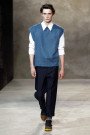 Neil Barrett stepped away from his sporty, street-vibe style and managed to change masculine classics from around the world to a modern universal wardrobe. The look was still urban and fresh, yet more ageless in design. He used batik prints, camouflage, nautical stripes and kimono patterns – reworked and fused together to conjure “an idea of a global masculinity.” The mix of patterns did not overwhelm, because Barrett kept them together with one color story: all gradations of navy and indigo, with touches of black and white. The tight palette counterbalanced a wider spectrum of fabrics, with lots of denim. Low in the crotch but narrow on the hip, cuffed or with rolled-up hems, the indigo bottoms let off an air of American workwear. Barrett performed the trick on non-denim, too, experimenting with slouchy and easy silhouettes as opposed to his usual sharp-cut look. As for tops, the designer went with spring’s hot new category: sleeveless V-neck tunics.