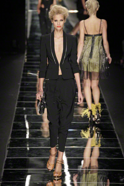 Well, glamorous it was, and polished but somehow it lacked a certain softness and sensuality. Maybe it’s because of the mix of equestrian elements like striped, double-breasted jockey-jackets, the green/ocre/white and black. Or the straight lines and hard metallics.