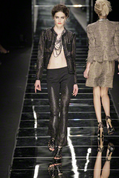 From the flowing, moody jewel-colored Seventies style to a more constructed, hard and geometric jazzy style – that’s the turn Gucci-designer Frida Giannini took this season. And this anniversary-collection looks quite different. Polished as ever, but with jazzy influences (flapper-dresses), references from the Twenties and Thirties, Louise Brooks, African Art and Man Ray. But also the geometric lines of the art deco style the American way – as in the Chrysler building – and the metallic surfaces. Giannini herself said in the show-notes she wanted to show an optical side of femininity, a sculptural glamor.