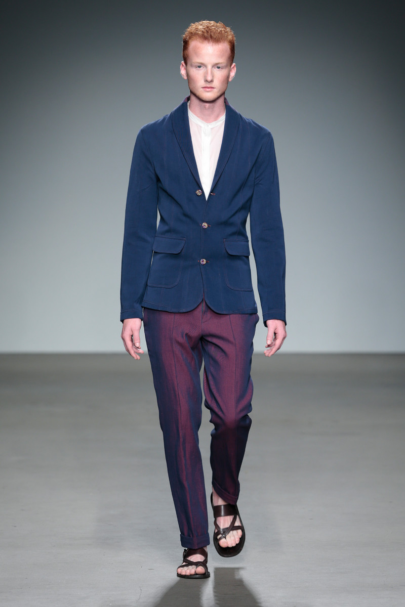 Fresh faced male models walked the runway at Mevan Kaluarachchi’s show this week. They sported the young Sri Lanka born designer’s perfectly tailored collection, which contained just about every piece a man needs during summer time. Like sand colored shorts, denim shorts and even light blue colored shiny shorts. Like slouchy striped pants and narrow pleated pants. Like (slightly transparent) white Tees and longsleeves. Like a cardigan with a baseball fit and a sportive checked jacket with leather details. Like short leather jackets, denim jumpsuits and shiny hooded jackets. Like duo colored sleeveless tops and white shirts. Like a decent leather bag, a cool pair of sunglasses and some casual sandals, all given the Mevan twist.