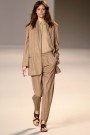After four years of silence Phoebe Philo (who formerly worked for Chloé) showed a new collection during her runway debut for Celine. By deciding a new iconic look she went back to basic. The clothes looked sober in shades of beige, white and camel. There were hardly any accessories and Philo only used one or two pieces of clothing per outfit. No fuss but clear, tight and wearable shapes and fits. ‘A kind of contemporary minimalism’, as she called it herself. Philo designed many leather pieces, almost all without visible seams, pockets, zippers or buttons. There were some cross-laced items, a few wide sleeves and several epaulettes. A leather coat with a rounded standing collar was the most striking piece of the collection. Philo’s Chloé-touch was visible in wide pants and wedge sandals. Of course the big question is: will Philo be able to bring back Celine’s success? Judging from the enthusiastic reactions of the audience, she will. (Tess van Daelen)