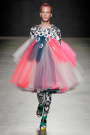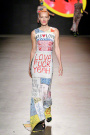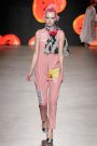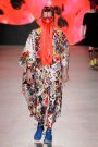 Different periodes melted together; sixties flairpants and floral prints clash with all American football influences, which include strong shoulders and sportswear inspired details.