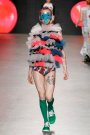 Rebecca Ward’s collection was all about curves. She presented a series of corset-inspired looks and added circular shapes to her bodies, skirts and pants. A structured grey skirt and a nude shaded body looked stunning, as did a kaleidoscopic nude dress. It might be a while before those futuristic pants get picked up, but they sure fit well in this small and cohesive collection.