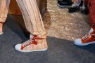 Rei Kawakubo sent an army of dressed-down guys onto her spring runway. Their hair dyed orange and clamped with studded leather headbands, the models navigated a grid of steel poles wearing pajama suits paired with slouchy overcoats. The designer underlined the collection’s rebellious mood by splicing together unexpected fabrics and silhouettes, such as a gray pinstripe coat with strips of black snakeskin and studded leather. Her simple shirt-and-pant combos came in fabrics that could come from a rocker’s wardrobe — red tartan, leopard print, camouflage and gold lame.