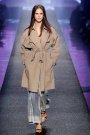 The setting of the show was a psychedelic projection of color and print, in front of which the models walked: in khaki safari suits and trench coats and dresses; in bustier tops and trousers with exotic prints; in off-the-shoulder dresses with a thick utility belt around the waist; in mint biker jackets; in parka jackets; and in those tiger jumpers. This time the tiger came disguised amongst a graphic crowd of lines. There were camouflage leopard prints in yellow and blue, and it came in orange and green later.