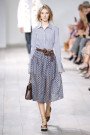 Seethrough such skirts played a role in Kors’ prevailing silhouette — waist-centric with a full skirt that indeed hints at the Fifties without ever making the trip to retro. The polite transparency recurred as well, wearability achieved when paired with crisp, elongated skirts.