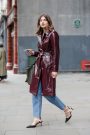 Her spring collection was flush with great color — soft, mineral blue, pink and lavender as well as vivid red — worked on silhouettes that exuded gentle power. Pertly tailored takes on utility shirts, some done in men’s checks, were paired with light pencil skirts. Fluid oversized shirts were layered over easy, wide-legged pants, and new suits came with boxy blazers and slim pants. A red dress with a high, gracefully ruffled neckline and cutaway panel at the waist was cut in a relaxed but seductive line. Many silhouettes were covered up, but not without allure or playfulness. Candy-colored glitter pumps and the occasional jeweled anklet offset the collection’s womanly sophistication with the perfect boost of girlish whimsy.