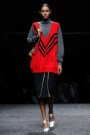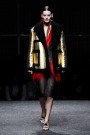 Balmain’s designer Olivier Rousteing dresses his global army of freedom in a dramatic, military-turned-tribal collection. Here with optical leather weave wrap skirt topped with an electric pop of red lamb’s fur.
