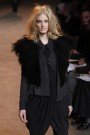 Romantic and very feminine, in an almost cliche way – that’s what Thakoons fall collection reflected. An undercurrent of sly irony and subversive sexuality coursed through the collection, winking at bad taste along the way. A camel coatdress that looked plain and proper from the front had an exciting purple leopard-printed pony collar and a leather basket-weave panel in the back. Crinkled patent leather came in black and wild pink. Chubby sweaters were laced with Mongolian fur. And for the girl who doesn’t wear her heart on her sleeve, there was chic understatement too, such as a black halter — completely backless — worn with matching trousers.