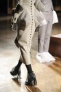Ten coffins had been arranged in a row. They held the bodies of “ten beautiful girls who died for fashion,” according to a gray-suited female rector who introduced the scenario at Thom Browne. The clothes were meant to represent their final reverie. Browne’s scenario called for his victims to be reanimated by their love of fashion. They clambered out of their coffins and stood sentinel-like while models meandered around them. They were dressed in layered, folded, draped, parachuted and reptilian-spiked creations. Tailored jackets and skirts of varying lengths were layered on top of one another while fox scarves in wool, complete with head and legs, were draped over models’ shoulders.