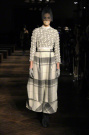Underneath there were elements of Browne’s menswear vocabulary: checks, extreme proportions, difficult layering, and an absolute upending of red-white-and-blue tradition. Browne encased each woman in ultra-stiff, tailored layers done in exaggerated proportions with a preppy, varsity theme. There were shrunken suits in mismatched plaids, blazers with giant peplums and layered maxi coats with shirttail hems, some of which will be wearable once the look is dismantled.