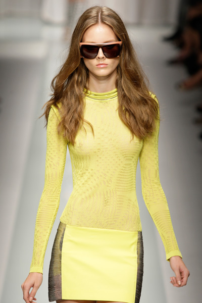 For her SS2010 collection Donatella Versace told everyone she was inspired by the idea of a fantasyland. This inspiration was visualized by the use of bright pastels, many different prints and plastic see-through materials, which all gave a barbiedoll-feeling to it. A lot of dresses and skirts were shown, sometimes combined with a jacket. There were also some very slim pants, looking more like leggings. Because of the different geometric patterns some of the dresses seemed to be a combination of a skirt and a top, stitched together. The legs of the models looked endless on the runway due to the fact that the girls wore platform shoes and ultra-short skirts and dresses. There was also a lot of leg shown wearing the evening gowns with a very high slit and silver metallic accents. Altogether Donatella Versace showed off a vivid, youthfull, sexy and indeed fantasy-like collection. (Tess van Daelen)