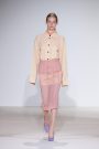 To balance that, she also experimented with volume, sending out bubble skirts and others that flared generously to below the knee over flat shoes. Outerwear was strong: Softly structured clutch coats with fringe detailing at the hem shared the runway with more sartorially, sharply tailored numbers in menswear checks.