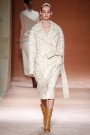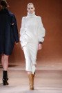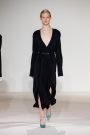 She went on with tailoring and made that visible in her coats. Some of her shift dresses read Swinging Sixties, but there were also sexy looks: lean silhouettes cinched at the waist with slits that showed lots of leg. The designer also played with new proportions. Very chic were her structured, draped and belted tuxedo dresses. For evening she presented some takes on the smoking, with a coat and dress featuring trompe l’oeil sleeves which looked as if they were elegantly hanging off the models’ shoulders.
