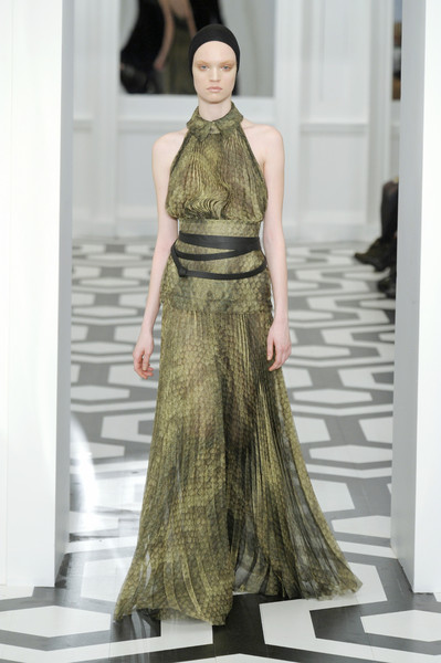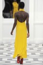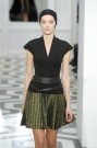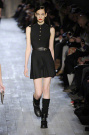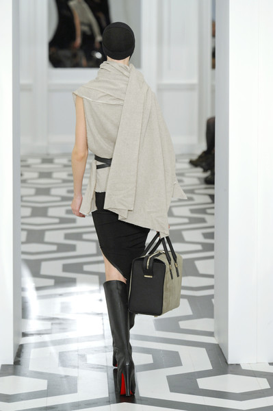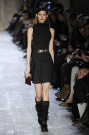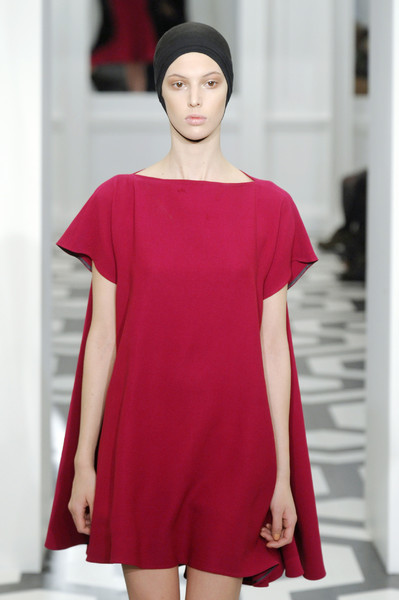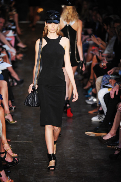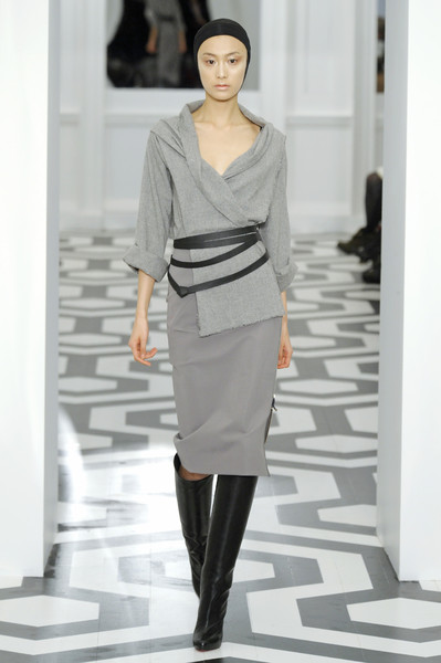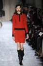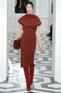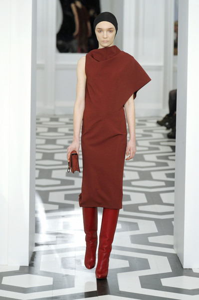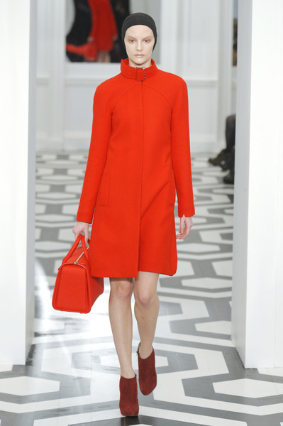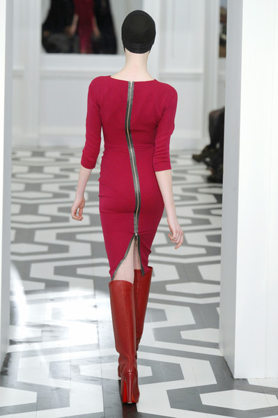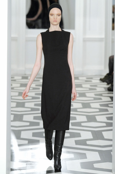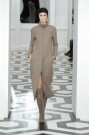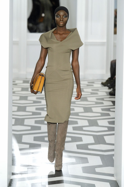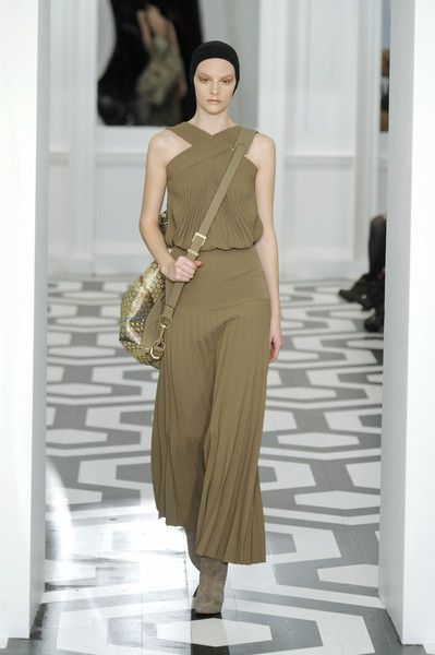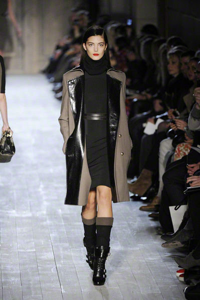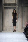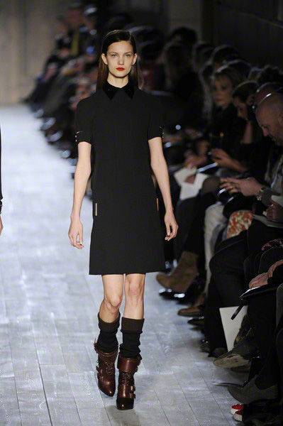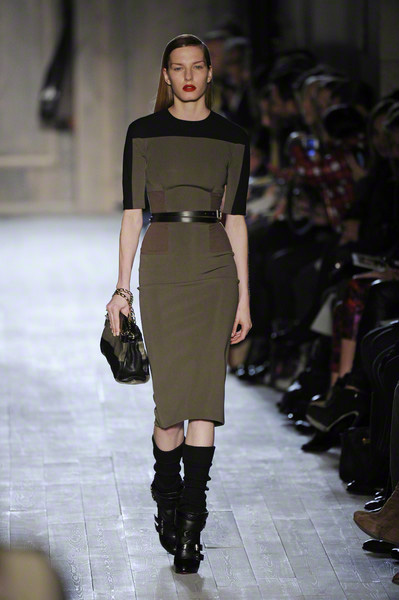Victoria Beckham stayed true to her specific style of dressing: simple, lean and sexy – but this time she added some military influences to her fall collection. The sportiness of last season was gone. Beckham focused at her favorite garment: dresses. They came in strethced knits, were body hugging and stopped right above or just below the knee. There was a buttoned-up feel with pointed collars hovering at the neckline of many of the pieces, shown in an army green, black, brown, orange, and sky blue.