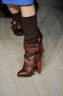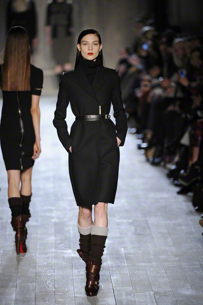 The coats looked sturdy, but were still elegant. Beckham kept the details subdued, a row of gold buttons, an epaulet, or graphic stripe across the body or the side. The styling was daring, with the slouchy socks over buckled-up Louboutin-boots.