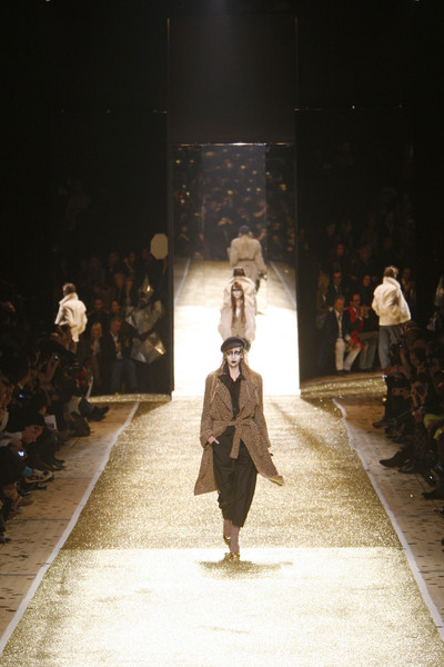 The Westwood show, attended by the likes of Kanye West and Boy George, was one big parade of over-the-top looks. On a golden runway models with dark make-up, crazy headpieces, funky hairdo’s, big big earing, knee socks and costume-like clothing appeared.