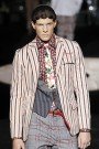 A show of Vivienne Westwood is always like a little party: you know she’ll send out sexy hunks in funny clothes with some kind of message. This time the models looked scary with their Joker-smile and Zorro-masks. The collection was a little predictable: printed shirts, full trousers, colorful sportswear and a gimmick now and then.