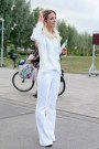 Countless fashion lovers dress head to toe in black every single day. A smart, safe style option you can never go wrong with. Now it seems there’s a pretty good alternative to all that black; fully dressing in white. Big brands like Chloé, Alexander Wang, Comme des Garcons, DKNY, Emilio Pucci, Givenchy, Jil Sander, Lacoste, Marni, Missoni and Rochas all picked up this positive, clean and summer proof trend. With looks ranging from tuxedo to sporty chic, from casual to more party inspired. The strongest SS2013 looks contain not only multiple white fashion pieces, but have different materials too. So mix your light knits with some crispy white sheer parts and add some jersey details along the way. Russian streetstyle sensations Mira Duma and Anya Ziourova have already been sporting this trend for a few seasons and it won’t be long till the rest of the world follows. Once you go completely white it just feels right.