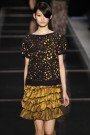 Yamamoto showed a fine collection of navy, black and ivory pieces. He designed lots of sober asymmetrical coats and pinafore dresses. Pleated and netting fabrics were used a lot.