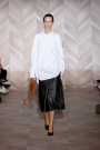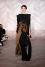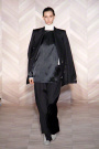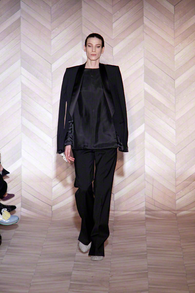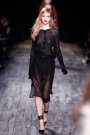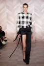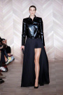 At Mugler, the creative director Nicola Formichetti and designer Sébastien Peigné, linked directly to Thierry Mugler. Their point of reference was the designer’s 1997 “insects” couture collection, with supermodels in patent leather and bug-eyed masks. It resulted in a subtle translation like in the pattern of a black and white dress with super-sized shoulders and glossy black croc appliqués on a sheer form-fitting dress.