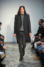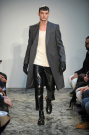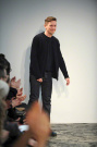 The male models walking the show often appeared like girls, due to their crazy black wigs, but also because of the very feminine designs they got put on. They wore tailored polka dot coats, pleated skirts and long tunics. Not to mention the rose print that popped up on some dark colored jackets and pants.