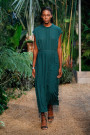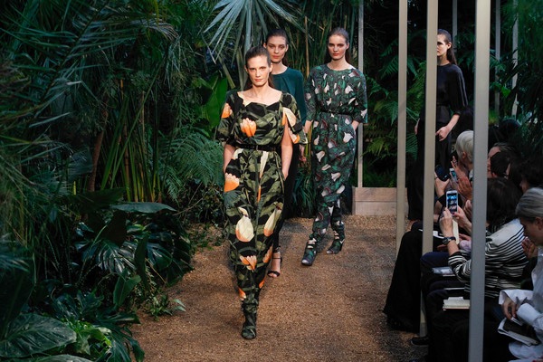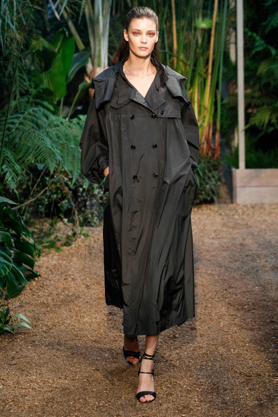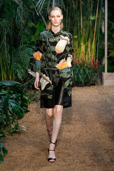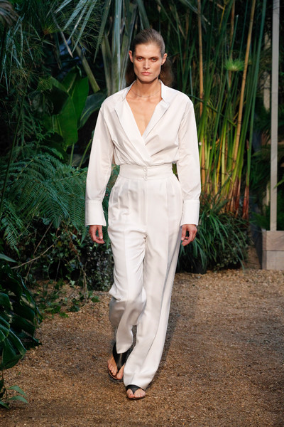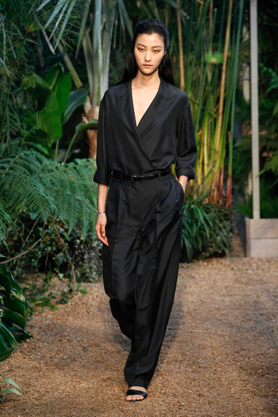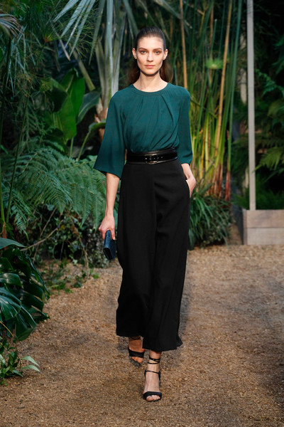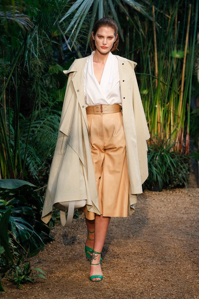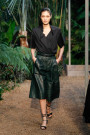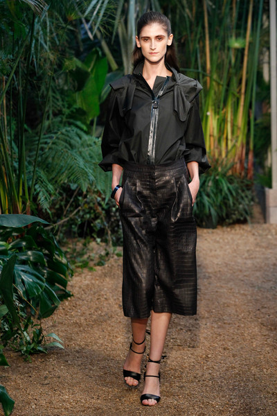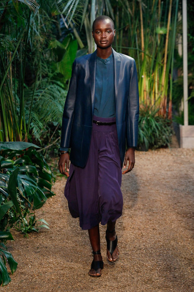 Christophe Lemaire took Hermès into the jungle for Spring. Lemaire’s big influence was Henri Rousseau, the Frenchman who painted jungles without ever having seen them. The pendulous flora of Rousseau’s work were duplicated in the print that opened the show, with boots to match. The artist’s dark jungle green colored tops, shifts, crocodile culottes, and a wrapped leather coat. It was, in fact, color that marched this collection on: mulberry, teal, sky blue, sunset orange.