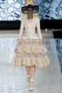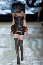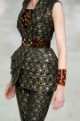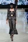 Burton transported the honeycomb shape into jacquards, nets and laces, some embroidered with bees, and used all kinds of iridescent versions of honey, gold and black. She opened with wasp-waist jackets, their peplums constructed for exaggeration over bustiers; thin skirts or pants and boots made from a crystal-studded stretch of netting that ran up the leg. The focus was on the hips. As the collection went on, Burton began to undress and add, putting cages and corsets on the outside as dresses. Eventually these went undercover in eveningwear.
