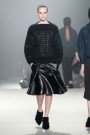 Alexander Wang was looking for something different in his fall 2013 collection. No neoprene, no modern techno-fabrics. Instead he went for the natural, fuzzy and warm: mohair, alpaca, astrakhan and anything that reminded him of hair. The result was an interesting and even edgy collection. Lots of outerwear of course with brushed denim and knit skirts. Romy coats were shaped by thick folds whether exaggerated lapels or tucks that created a rounded shoulder and tapered sleeve. Many of the coats were dark and sometimes even aggressive, but beautiful too. Wang handled the volume and fabric density with elegance. Wang’s other major element was the tuxedo in satin.