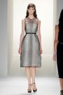 The show opened with boxy leather bombers and lean, sleeveless coats with zippers, colors were gleaming white or green. Grid patterns, like windows on a skyscraper, were embroidered onto organza shift dresses, which were chic and managed to avoid the Space Age vibe. There were also split-hem skirts, sporty ribbed knits some of which coated in stripes and easy to wear shift dresses.