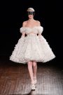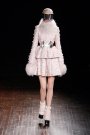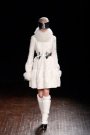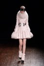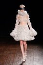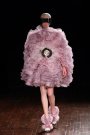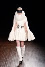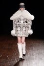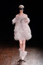Inspired by drawings of Aubrey Beardsley (an influential illustrator and writer in the late 19th century) Bill Gaytten came up with luxurious ensembles for English women. His models were all dressed up in asymmetrical capes and dresses with enormous collars, large gloves and feather fascinators as their accessories. Especially the delicate designs in pleated satin and embroidered sheer fabrics appeared graceful. Done in shades of olive green, cinnamon, light mint and ruby red they seemed perfect for winter. And even though you could see every bit of the models’ bodies through them it still made the girls look classy.